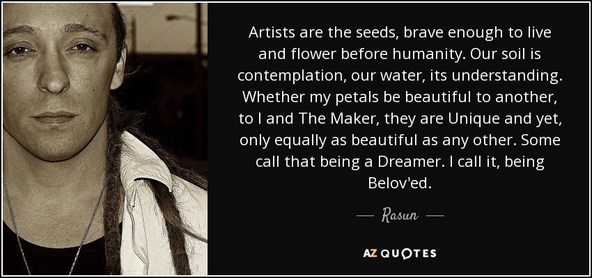 Artists are the seeds, brave enough to live and flower before humanity. Our soil is contemplation, our water, its understanding. Whether my petals be beautiful to another, to I and The Maker, they are Unique and yet, only equally as beautiful as any other. Some call that being a Dreamer. I call it, being Belov'ed.