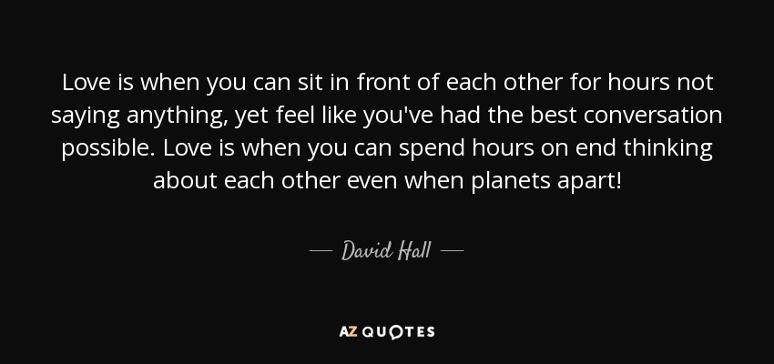 Love is when you can sit in front of each other for hours not saying anything, yet feel like you've had the best conversation possible. Love is when you can spend hours on end thinking about each other even when planets apart!