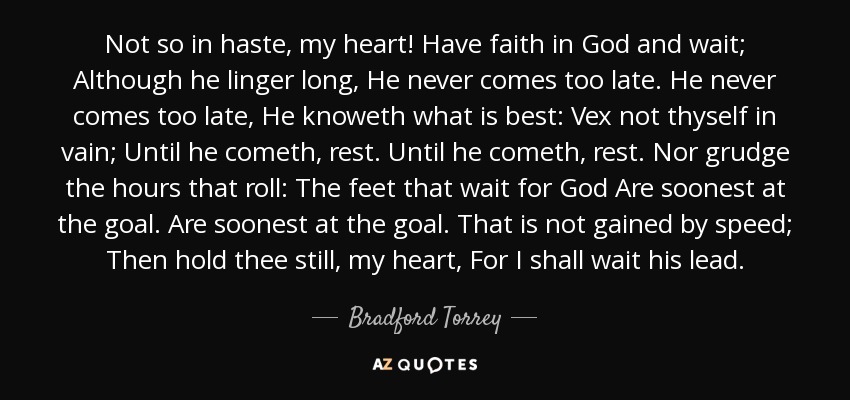 Not so in haste, my heart! Have faith in God and wait; Although he linger long, He never comes too late. He never comes too late, He knoweth what is best: Vex not thyself in vain; Until he cometh, rest. Until he cometh, rest. Nor grudge the hours that roll: The feet that wait for God Are soonest at the goal. Are soonest at the goal. That is not gained by speed; Then hold thee still, my heart, For I shall wait his lead.
