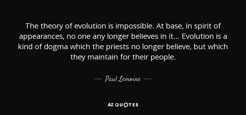 The theory of evolution is impossible. At base, in spirit of appearances, no one any longer believes in it... Evolution is a kind of dogma which the priests no longer believe, but which they maintain for their people.