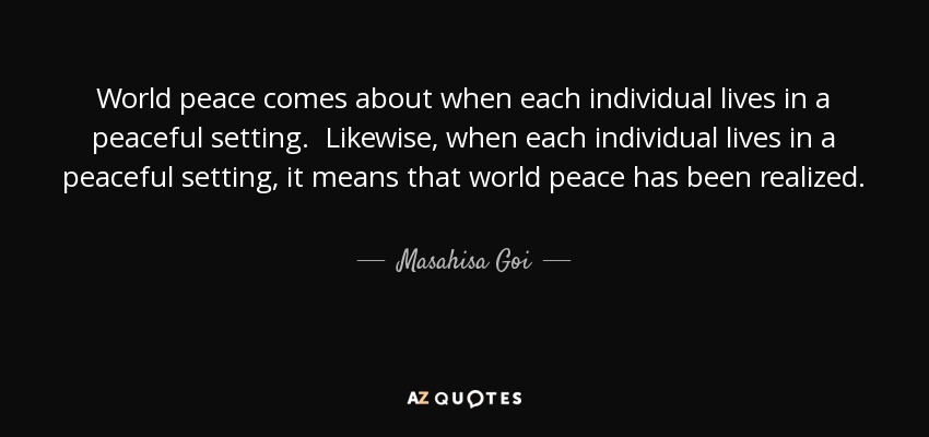 World peace comes about when each individual lives in a peaceful setting. Likewise, when each individual lives in a peaceful setting, it means that world peace has been realized.