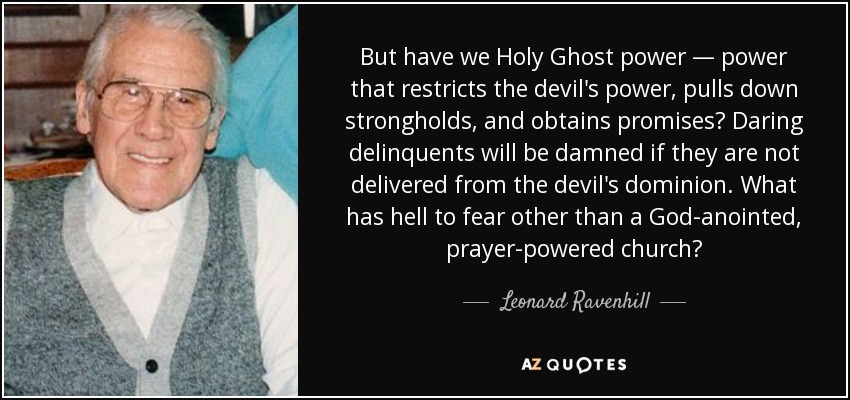 But have we Holy Ghost power — power that restricts the devil's power, pulls down strongholds, and obtains promises? Daring delinquents will be damned if they are not delivered from the devil's dominion. What has hell to fear other than a God-anointed, prayer-powered church?