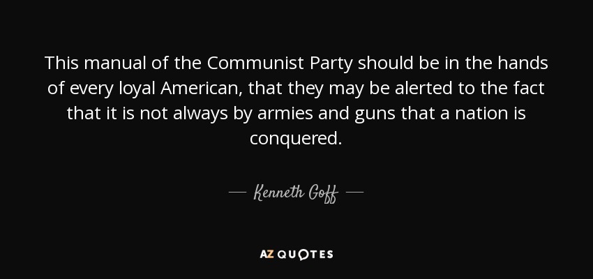 This manual of the Communist Party should be in the hands of every loyal American, that they may be alerted to the fact that it is not always by armies and guns that a nation is conquered.