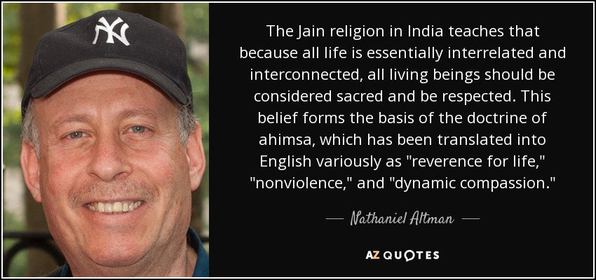The Jain religion in India teaches that because all life is essentially interrelated and interconnected, all living beings should be considered sacred and be respected. This belief forms the basis of the doctrine of ahimsa, which has been translated into English variously as "reverence for life," "nonviolence," and "dynamic compassion."