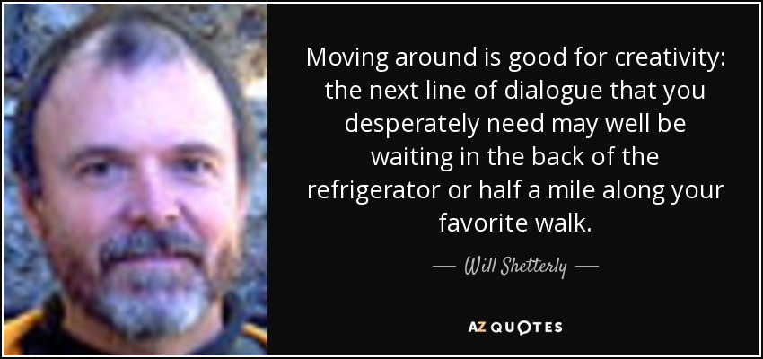 Moving around is good for creativity: the next line of dialogue that you desperately need may well be waiting in the back of the refrigerator or half a mile along your favorite walk.