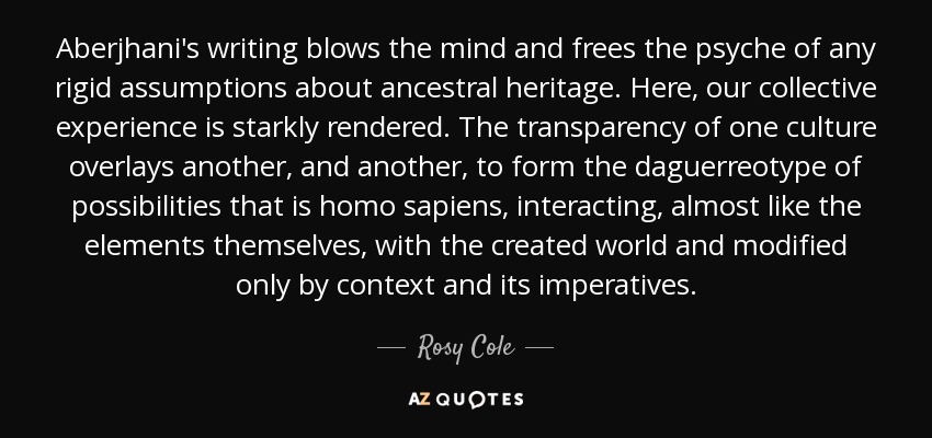 Aberjhani's writing blows the mind and frees the psyche of any rigid assumptions about ancestral heritage. Here, our collective experience is starkly rendered. The transparency of one culture overlays another, and another, to form the daguerreotype of possibilities that is homo sapiens, interacting, almost like the elements themselves, with the created world and modified only by context and its imperatives.