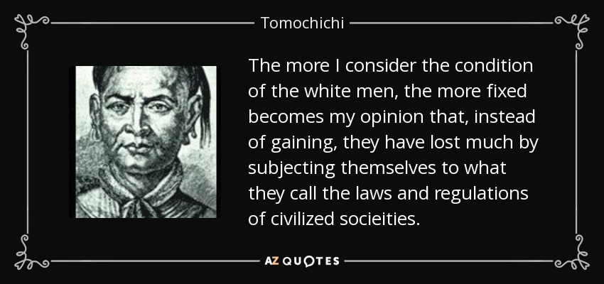 The more I consider the condition of the white men, the more fixed becomes my opinion that, instead of gaining, they have lost much by subjecting themselves to what they call the laws and regulations of civilized socieities.