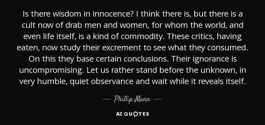 Is there wisdom in innocence? I think there is, but there is a cult now of drab men and women, for whom the world, and even life itself, is a kind of commodity. These critics, having eaten, now study their excrement to see what they consumed. On this they base certain conclusions. Their ignorance is uncompromising. Let us rather stand before the unknown, in very humble, quiet observance and wait while it reveals itself.