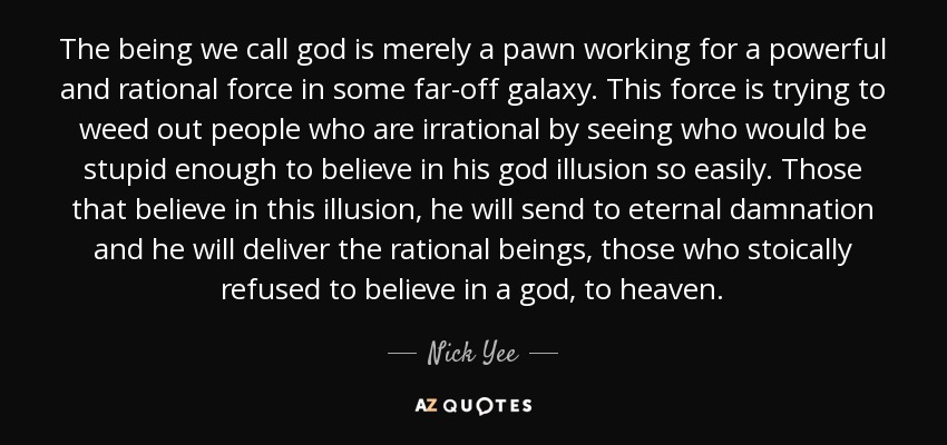 The being we call god is merely a pawn working for a powerful and rational force in some far-off galaxy. This force is trying to weed out people who are irrational by seeing who would be stupid enough to believe in his god illusion so easily. Those that believe in this illusion, he will send to eternal damnation and he will deliver the rational beings, those who stoically refused to believe in a god, to heaven.