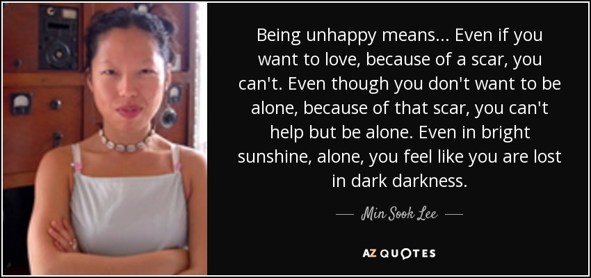 Being unhappy means... Even if you want to love, because of a scar, you can't. Even though you don't want to be alone, because of that scar, you can't help but be alone. Even in bright sunshine, alone, you feel like you are lost in dark darkness.