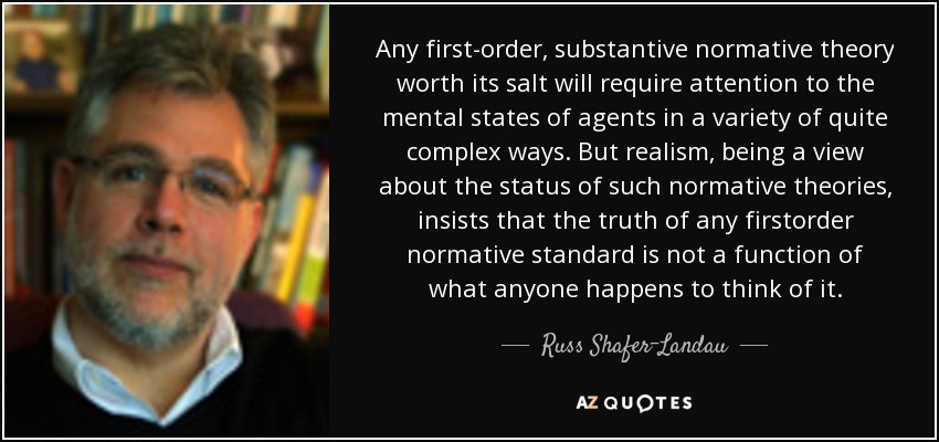 Any first-order, substantive normative theory worth its salt will require attention to the mental states of agents in a variety of quite complex ways. But realism, being a view about the status of such normative theories, insists that the truth of any firstorder normative standard is not a function of what anyone happens to think of it.