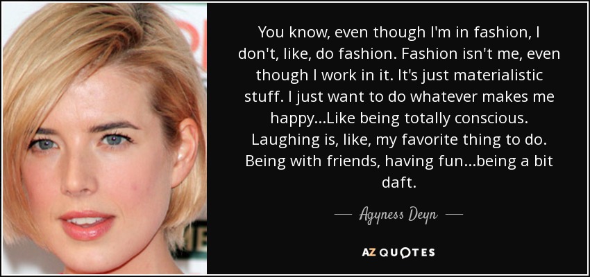 You know, even though I'm in fashion, I don't, like, do fashion. Fashion isn't me, even though I work in it. It's just materialistic stuff. I just want to do whatever makes me happy...Like being totally conscious. Laughing is, like, my favorite thing to do. Being with friends, having fun...being a bit daft.