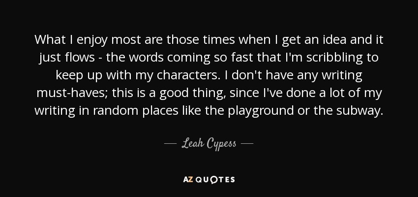 What I enjoy most are those times when I get an idea and it just flows - the words coming so fast that I'm scribbling to keep up with my characters. I don't have any writing must-haves; this is a good thing, since I've done a lot of my writing in random places like the playground or the subway.