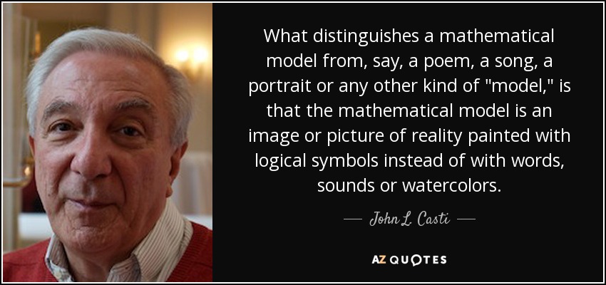 What distinguishes a mathematical model from, say, a poem, a song, a portrait or any other kind of "model," is that the mathematical model is an image or picture of reality painted with logical symbols instead of with words, sounds or watercolors.