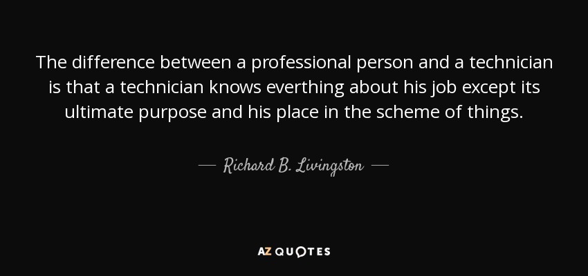 The difference between a professional person and a technician is that a technician knows everthing about his job except its ultimate purpose and his place in the scheme of things.