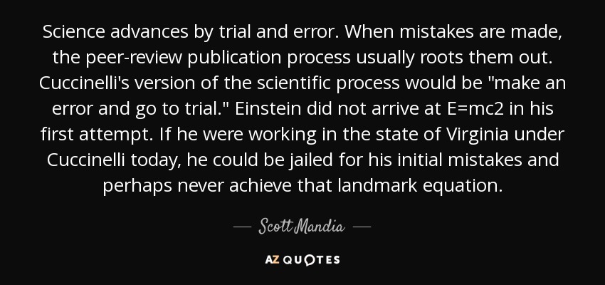 Science advances by trial and error. When mistakes are made, the peer-review publication process usually roots them out. Cuccinelli's version of the scientific process would be "make an error and go to trial." Einstein did not arrive at E=mc2 in his first attempt. If he were working in the state of Virginia under Cuccinelli today, he could be jailed for his initial mistakes and perhaps never achieve that landmark equation.