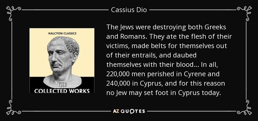 The Jews were destroying both Greeks and Romans. They ate the flesh of their victims, made belts for themselves out of their entrails, and daubed themselves with their blood... In all, 220,000 men perished in Cyrene and 240,000 in Cyprus, and for this reason no Jew may set foot in Cyprus today.