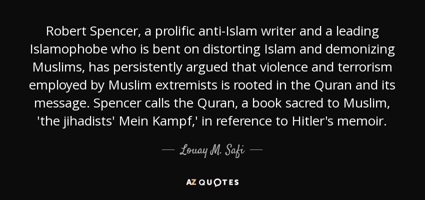 Robert Spencer, a prolific anti-Islam writer and a leading Islamophobe who is bent on distorting Islam and demonizing Muslims, has persistently argued that violence and terrorism employed by Muslim extremists is rooted in the Quran and its message. Spencer calls the Quran, a book sacred to Muslim, 'the jihadists' Mein Kampf,' in reference to Hitler's memoir.
