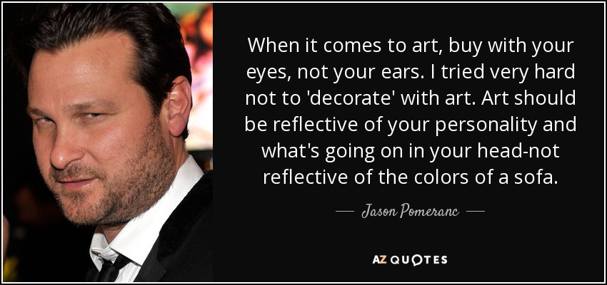 When it comes to art, buy with your eyes, not your ears. I tried very hard not to 'decorate' with art. Art should be reflective of your personality and what's going on in your head-not reflective of the colors of a sofa.