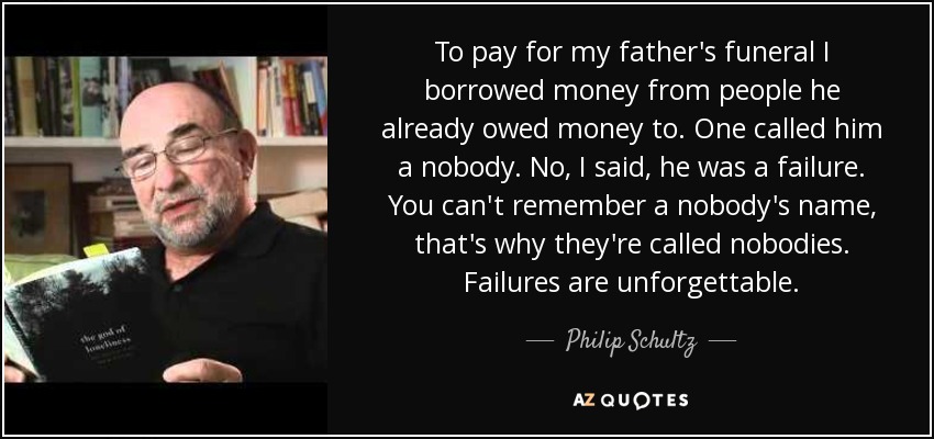 To pay for my father's funeral I borrowed money from people he already owed money to. One called him a nobody. No, I said, he was a failure. You can't remember a nobody's name, that's why they're called nobodies. Failures are unforgettable.