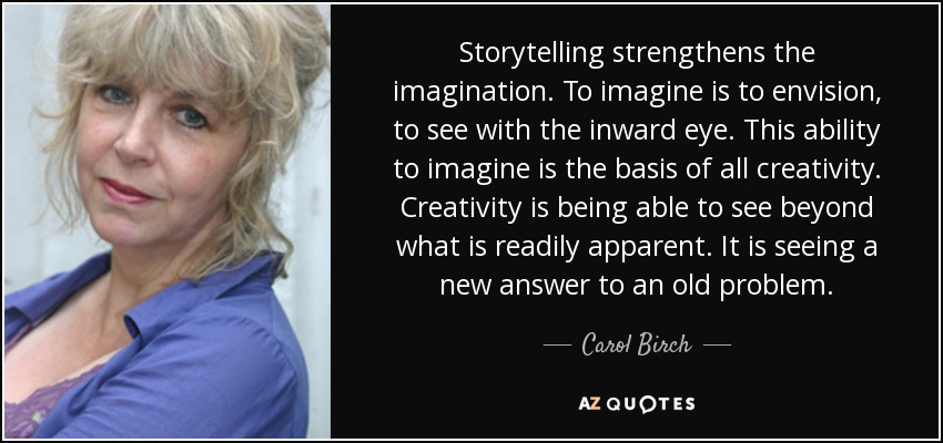 Storytelling strengthens the imagination. To imagine is to envision, to see with the inward eye. This ability to imagine is the basis of all creativity. Creativity is being able to see beyond what is readily apparent. It is seeing a new answer to an old problem.