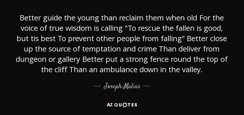 Better guide the young than reclaim them when old For the voice of true wisdom is calling "To rescue the fallen is good, but tis best To prevent other people from falling" Better close up the source of temptation and crime Than deliver from dungeon or gallery Better put a strong fence round the top of the cliff Than an ambulance down in the valley.