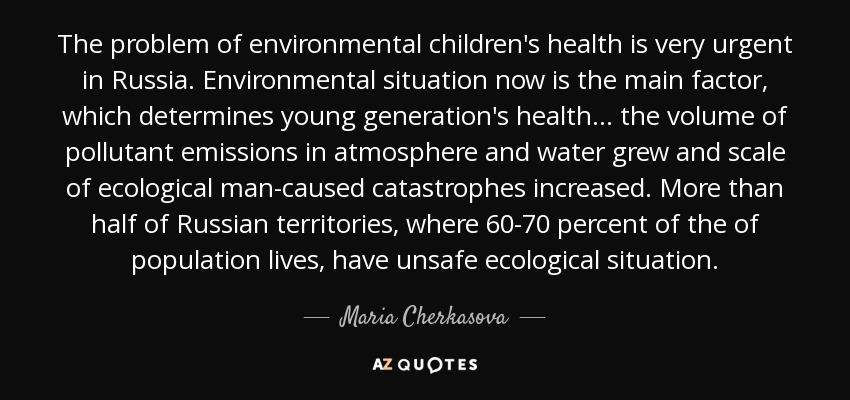 The problem of environmental children's health is very urgent in Russia. Environmental situation now is the main factor, which determines young generation's health... the volume of pollutant emissions in atmosphere and water grew and scale of ecological man-caused catastrophes increased. More than half of Russian territories, where 60-70 percent of the of population lives, have unsafe ecological situation.
