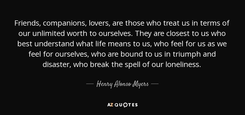 Friends, companions, lovers, are those who treat us in terms of our unlimited worth to ourselves. They are closest to us who best understand what life means to us, who feel for us as we feel for ourselves, who are bound to us in triumph and disaster, who break the spell of our loneliness.