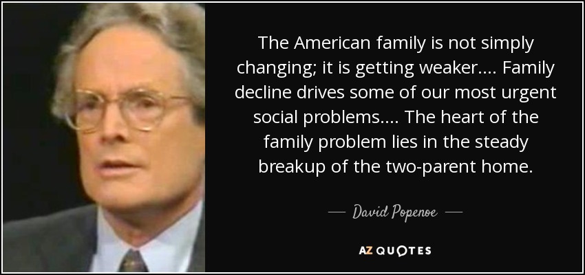 The American family is not simply changing; it is getting weaker. . . . Family decline drives some of our most urgent social problems. . . . The heart of the family problem lies in the steady breakup of the two-parent home.