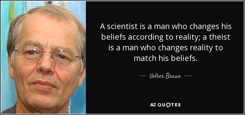A scientist is a man who changes his beliefs according to reality; a theist is a man who changes reality to match his beliefs.