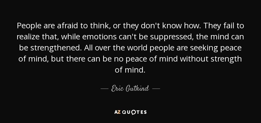 People are afraid to think, or they don't know how. They fail to realize that, while emotions can't be suppressed, the mind can be strengthened. All over the world people are seeking peace of mind, but there can be no peace of mind without strength of mind.