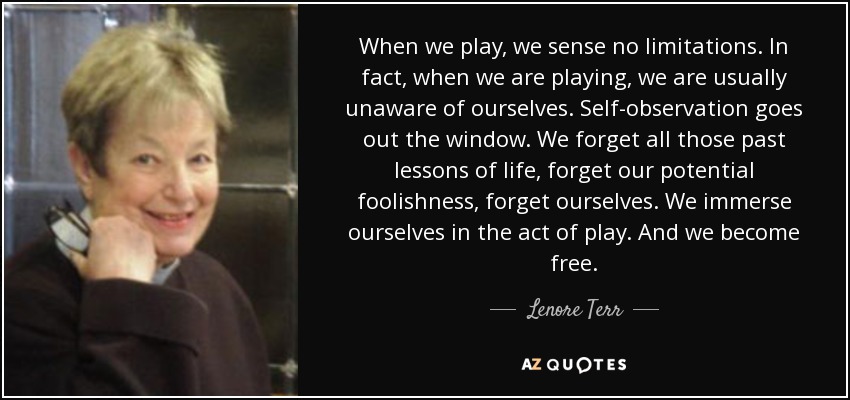 When we play, we sense no limitations. In fact, when we are playing, we are usually unaware of ourselves. Self-observation goes out the window. We forget all those past lessons of life, forget our potential foolishness, forget ourselves. We immerse ourselves in the act of play. And we become free.