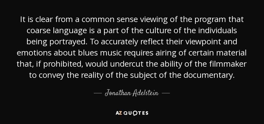 It is clear from a common sense viewing of the program that coarse language is a part of the culture of the individuals being portrayed. To accurately reflect their viewpoint and emotions about blues music requires airing of certain material that, if prohibited, would undercut the ability of the filmmaker to convey the reality of the subject of the documentary.