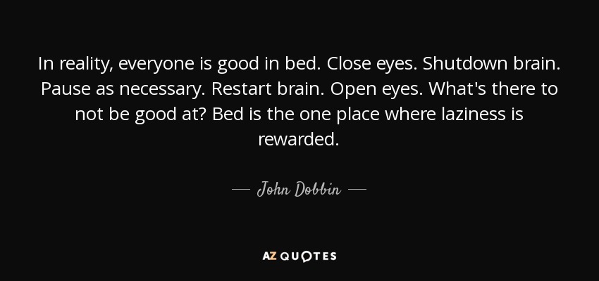 In reality, everyone is good in bed. Close eyes. Shutdown brain. Pause as necessary. Restart brain. Open eyes. What's there to not be good at? Bed is the one place where laziness is rewarded.