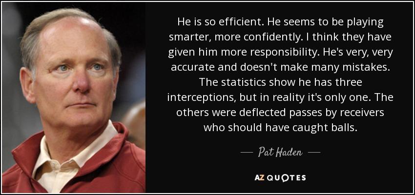 He is so efficient. He seems to be playing smarter, more confidently. I think they have given him more responsibility. He's very, very accurate and doesn't make many mistakes. The statistics show he has three interceptions, but in reality it's only one. The others were deflected passes by receivers who should have caught balls.