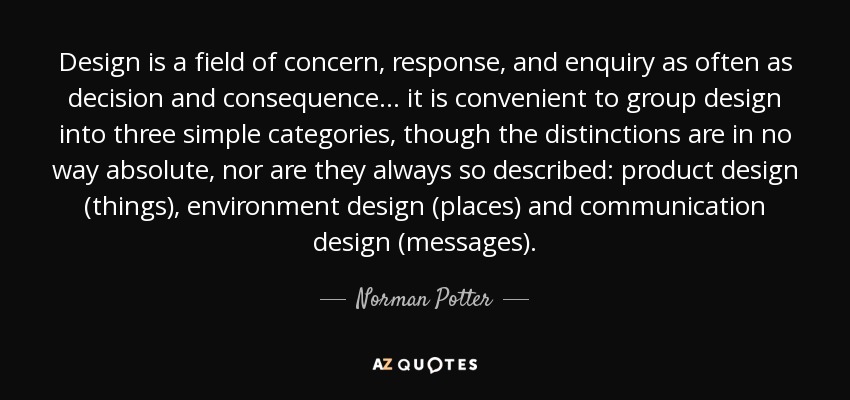 Design is a field of concern, response, and enquiry as often as decision and consequence... it is convenient to group design into three simple categories, though the distinctions are in no way absolute, nor are they always so described: product design (things), environment design (places) and communication design (messages).