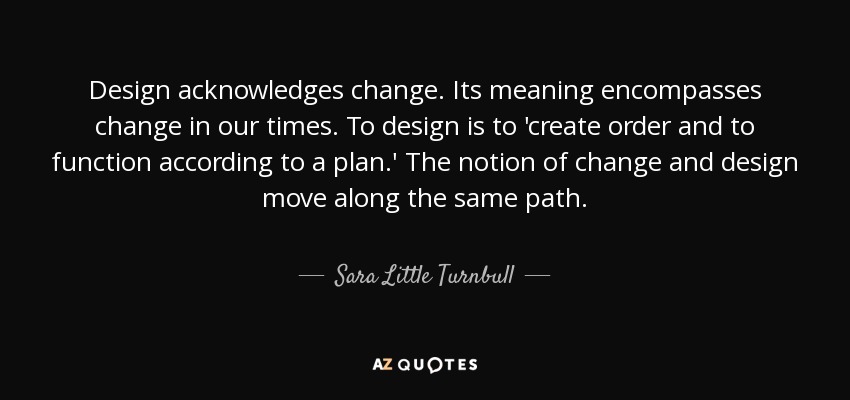 Design acknowledges change. Its meaning encompasses change in our times. To design is to 'create order and to function according to a plan.' The notion of change and design move along the same path.