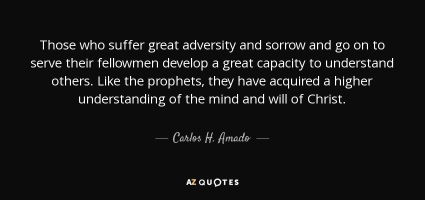 Those who suffer great adversity and sorrow and go on to serve their fellowmen develop a great capacity to understand others. Like the prophets, they have acquired a higher understanding of the mind and will of Christ.