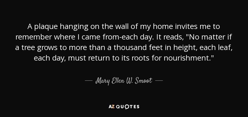 A plaque hanging on the wall of my home invites me to remember where I came from-each day. It reads, "No matter if a tree grows to more than a thousand feet in height, each leaf, each day, must return to its roots for nourishment."