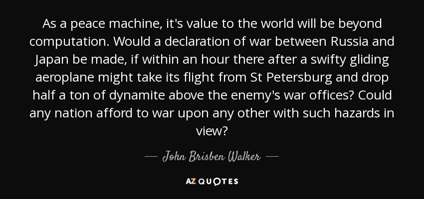 As a peace machine, it's value to the world will be beyond computation. Would a declaration of war between Russia and Japan be made, if within an hour there after a swifty gliding aeroplane might take its flight from St Petersburg and drop half a ton of dynamite above the enemy's war offices? Could any nation afford to war upon any other with such hazards in view?