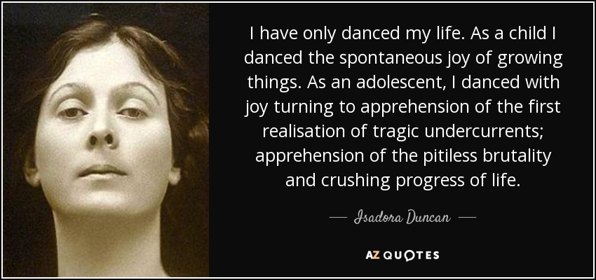 I have only danced my life. As a child I danced the spontaneous joy of growing things. As an adolescent, I danced with joy turning to apprehension of the first realisation of tragic undercurrents; apprehension of the pitiless brutality and crushing progress of life.