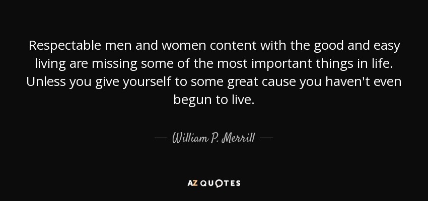 Respectable men and women content with the good and easy living are missing some of the most important things in life. Unless you give yourself to some great cause you haven't even begun to live.