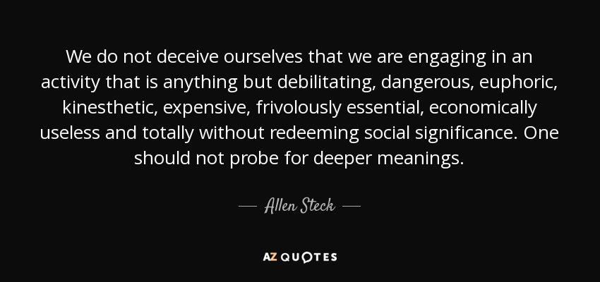 We do not deceive ourselves that we are engaging in an activity that is anything but debilitating, dangerous, euphoric, kinesthetic, expensive, frivolously essential, economically useless and totally without redeeming social significance. One should not probe for deeper meanings.