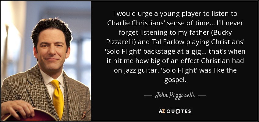 I would urge a young player to listen to Charlie Christians' sense of time ... I'll never forget listening to my father (Bucky Pizzarelli) and Tal Farlow playing Christians' 'Solo Flight' backstage at a gig... that's when it hit me how big of an effect Christian had on jazz guitar. 'Solo Flight' was like the gospel.