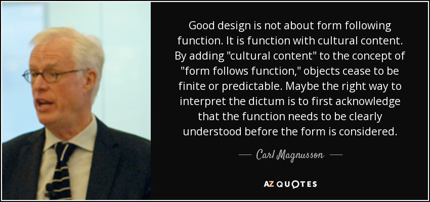 Good design is not about form following function. It is function with cultural content. By adding "cultural content" to the concept of "form follows function," objects cease to be finite or predictable. Maybe the right way to interpret the dictum is to first acknowledge that the function needs to be clearly understood before the form is considered.