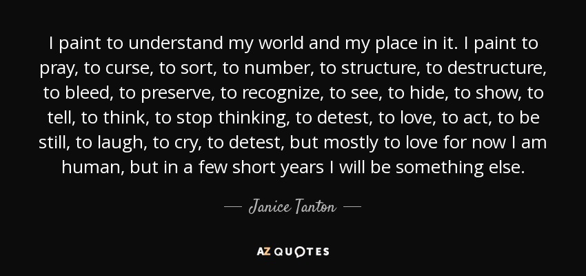 I paint to understand my world and my place in it. I paint to pray, to curse, to sort, to number, to structure, to destructure, to bleed, to preserve, to recognize, to see, to hide, to show, to tell, to think, to stop thinking, to detest, to love, to act, to be still, to laugh, to cry, to detest, but mostly to love for now I am human, but in a few short years I will be something else.