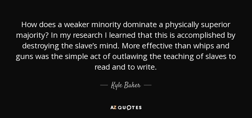 How does a weaker minority dominate a physically superior majority? In my research I learned that this is accomplished by destroying the slave’s mind. More effective than whips and guns was the simple act of outlawing the teaching of slaves to read and to write.