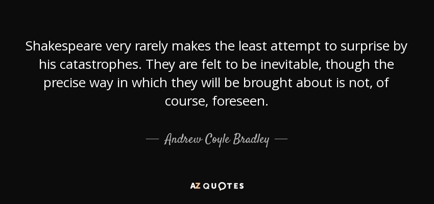 Shakespeare very rarely makes the least attempt to surprise by his catastrophes. They are felt to be inevitable, though the precise way in which they will be brought about is not, of course, foreseen.