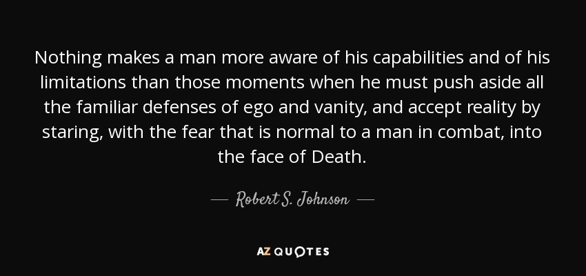 Nothing makes a man more aware of his capabilities and of his limitations than those moments when he must push aside all the familiar defenses of ego and vanity, and accept reality by staring, with the fear that is normal to a man in combat, into the face of Death.
