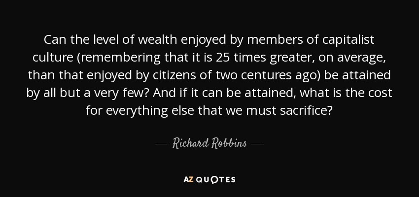 Can the level of wealth enjoyed by members of capitalist culture (remembering that it is 25 times greater, on average, than that enjoyed by citizens of two centures ago) be attained by all but a very few? And if it can be attained, what is the cost for everything else that we must sacrifice?